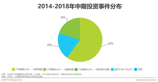 根据近五年的投资事件分布,经营传统场景和电梯场景业务的户外媒体公司发展较为成熟,获投轮次偏中期往后,并且,80%的战略投资对象和大部分资金都集中于梯媒;而早期投资则主要集中于数字户外广告公司,部分已开始获取中期投资。预计在未来,梯媒和数字户外将继续是户外广告市场中最具发展和投资价值的对象。